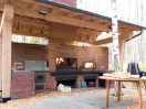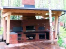 Печной комплекс выполнен в едином стиле, в конструкции предусмотрен деревянный навес, комплекс отделан клинкерной плиткой Strohe.