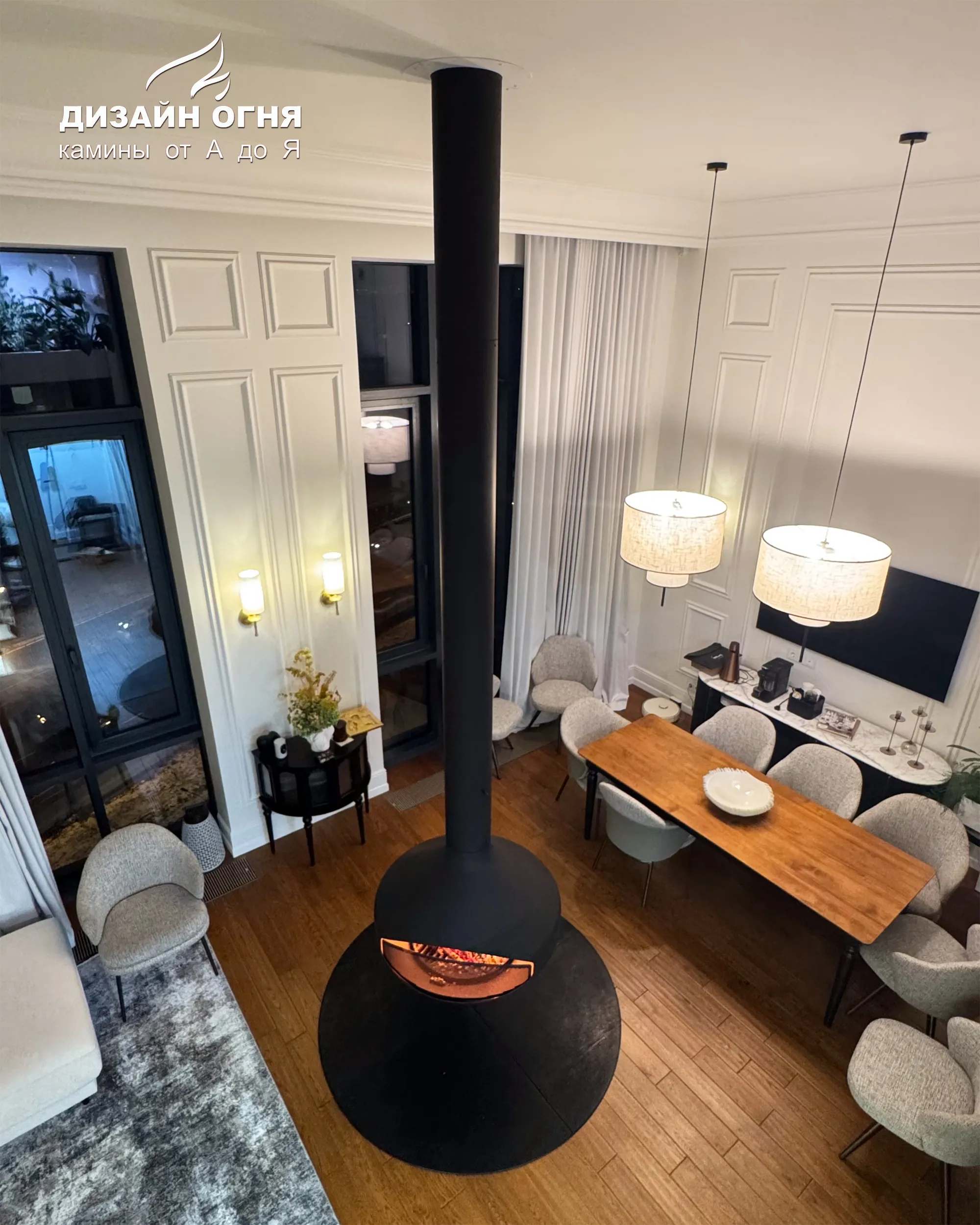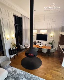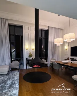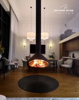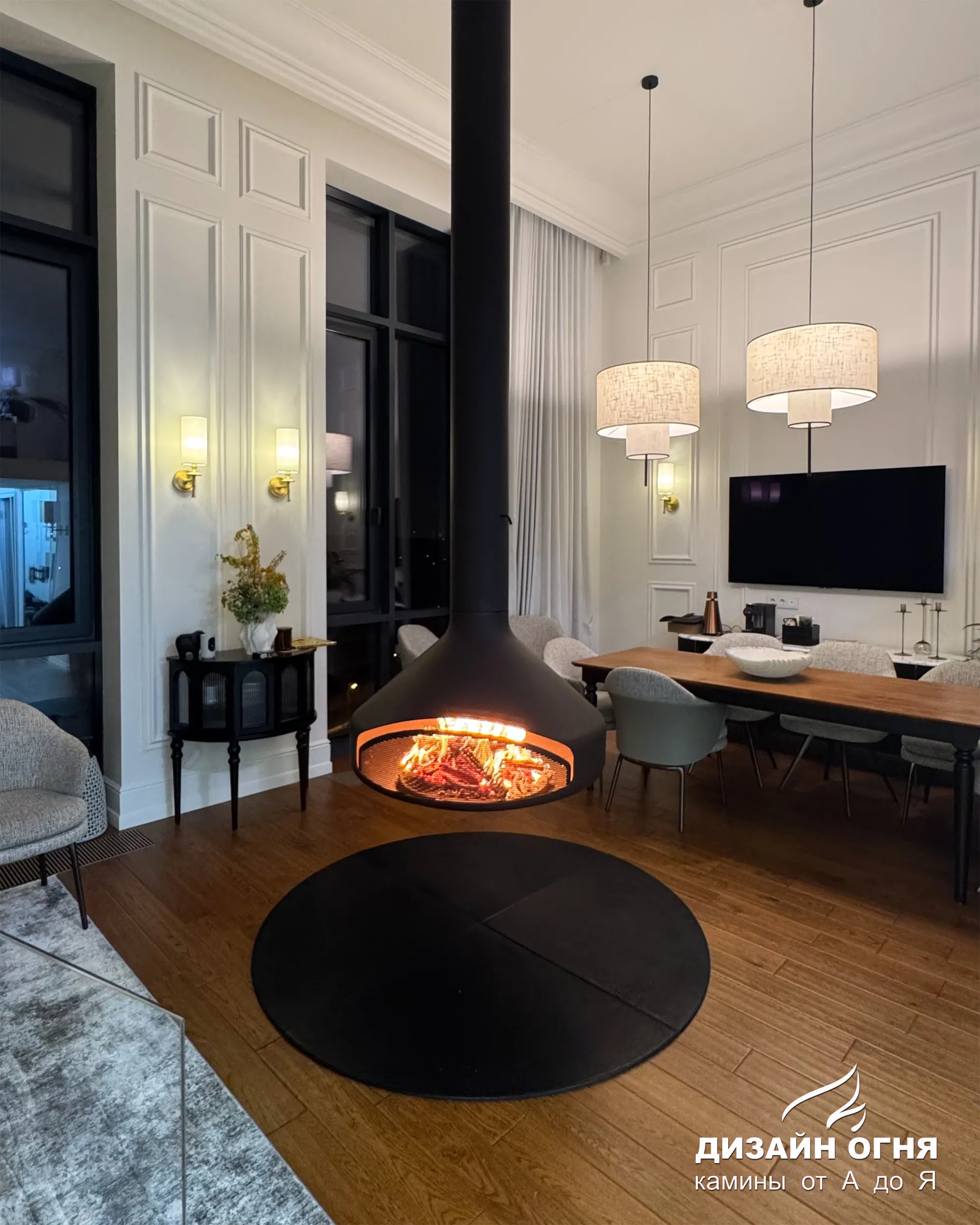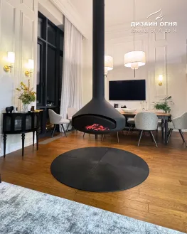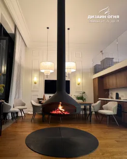 Задача от заказчика была нестандартной и очень интересной: установить настоящий дровяной камин в квартире, но не обычный, а такой, чтобы пламенем можно было любоваться из любой точки гостиной. Пространство — компактное, но техническая возможность для дымохода была. Вызов принят!