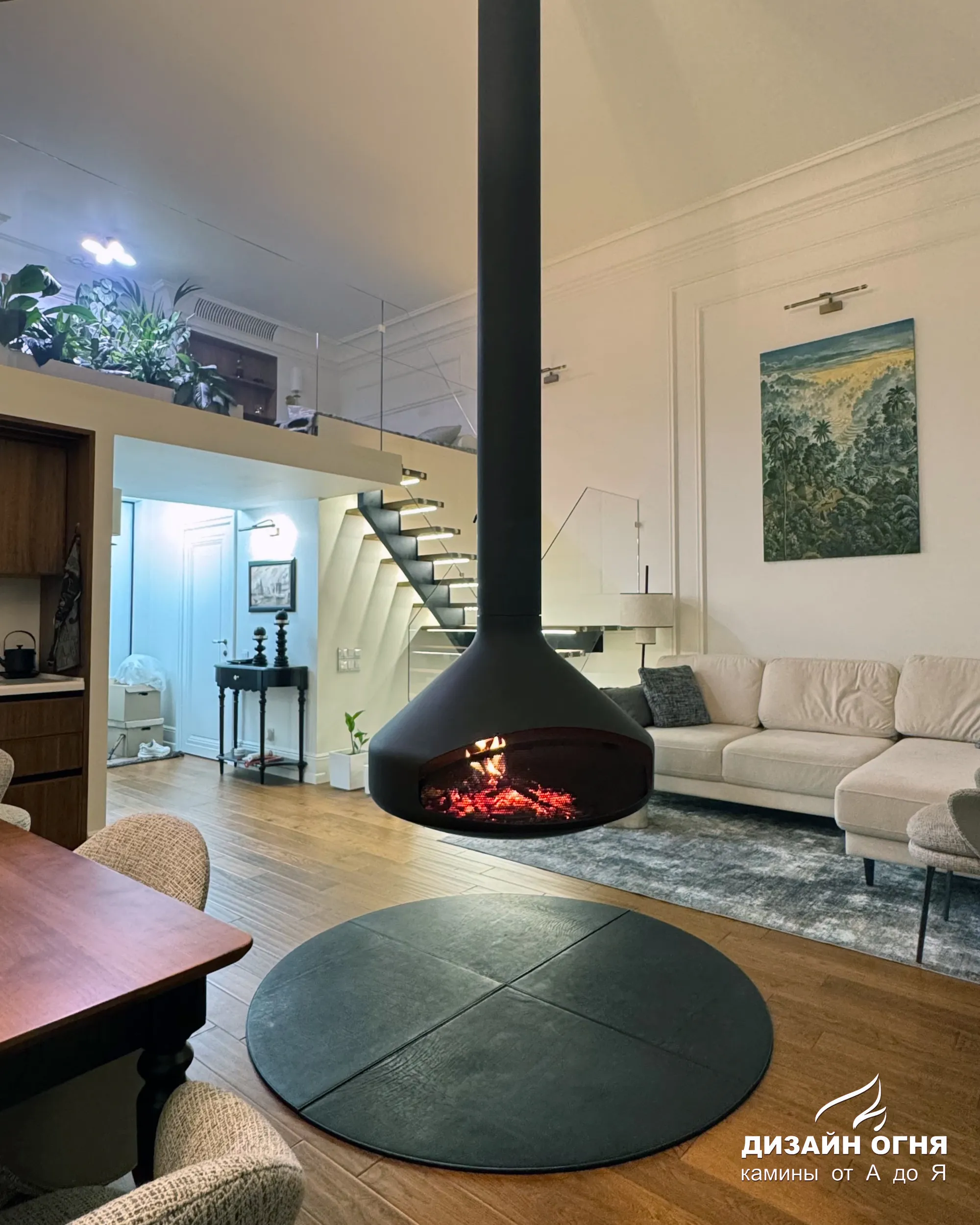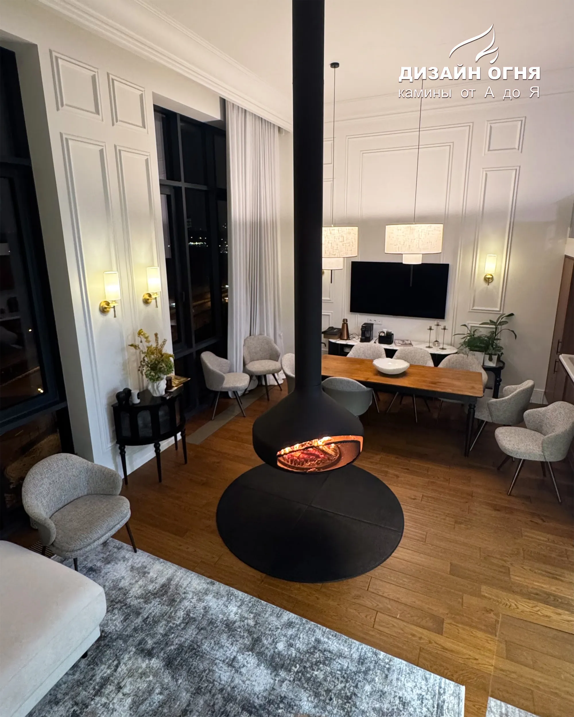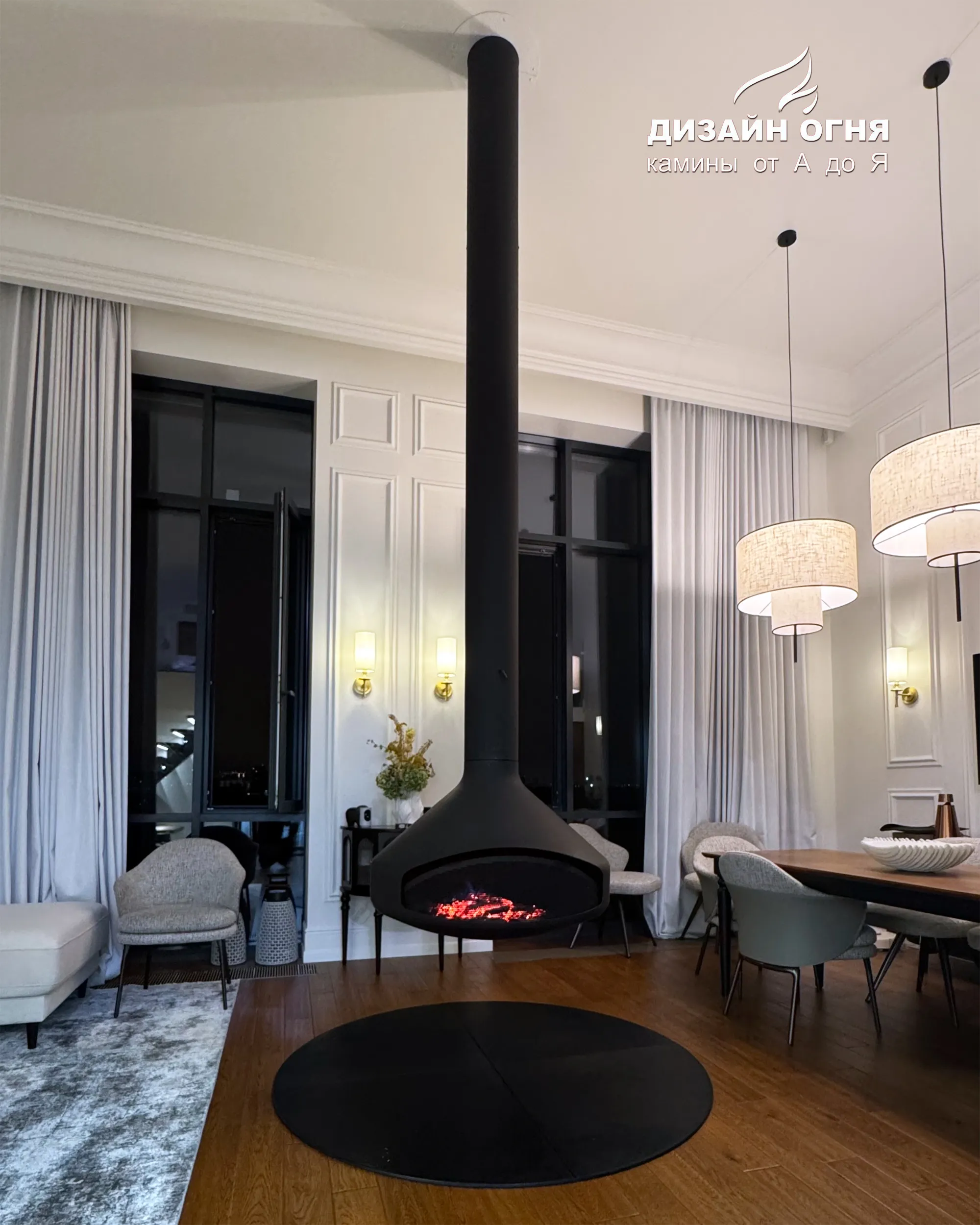 Задача от заказчика была нестандартной и очень интересной: установить настоящий дровяной камин в квартире, но не обычный, а такой, чтобы пламенем можно было любоваться из любой точки гостиной. Пространство — компактное, но техническая возможность для дымохода была. Вызов принят!