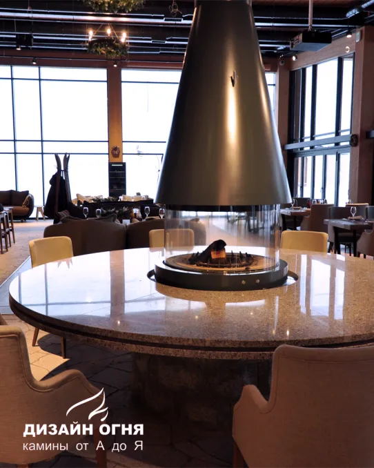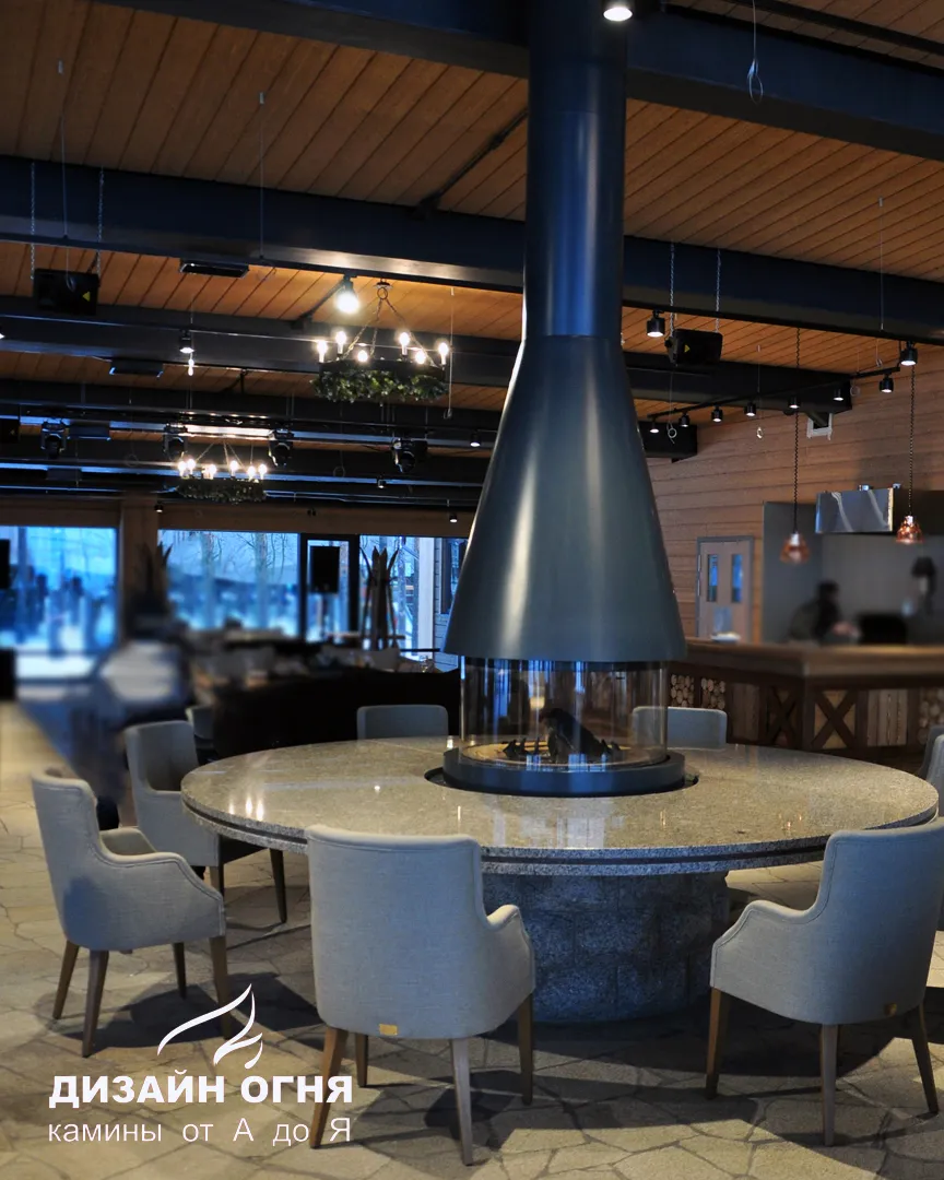 И курорт Охта Парк не стал искать особенного время привовождения. Прямо у подножия склона расположился огромный по своим размером ресторан. Где гости могут удобно устроиться за столиками, отдыхать и наслаждаться видами. Идеальным акцентом может стать стол с камином от итальянского производителя Piazzetta.