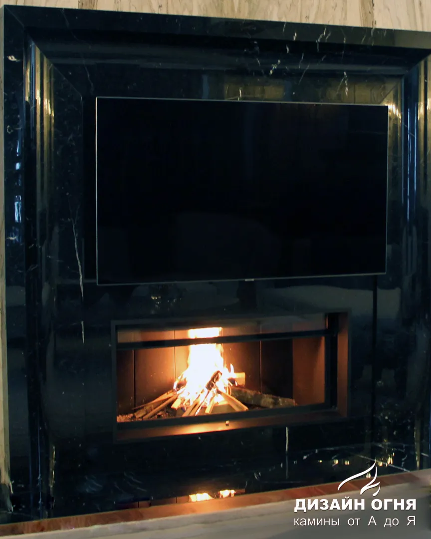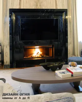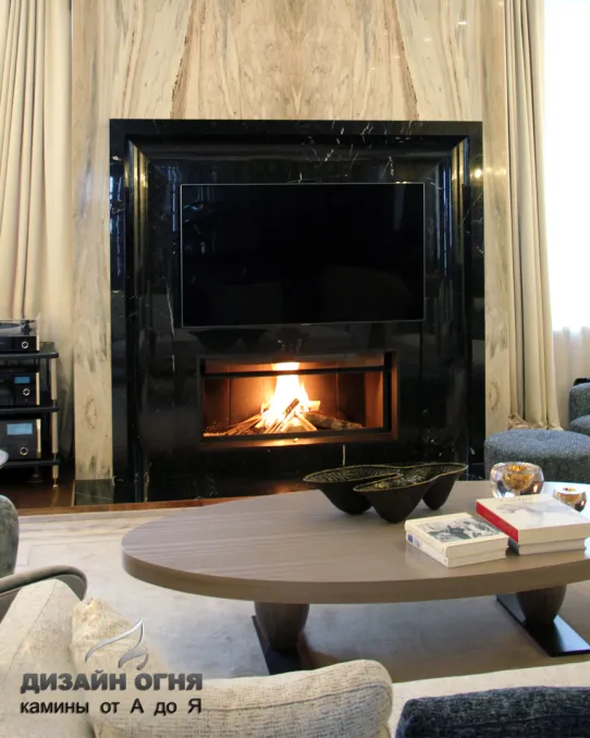 Телевизор "спрятан" внутри мраморного портала. Стилистический ход от "Бахарев и партнеры".
