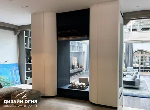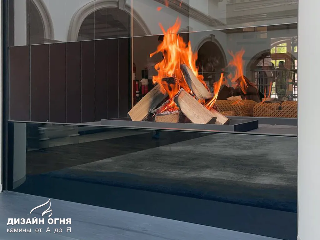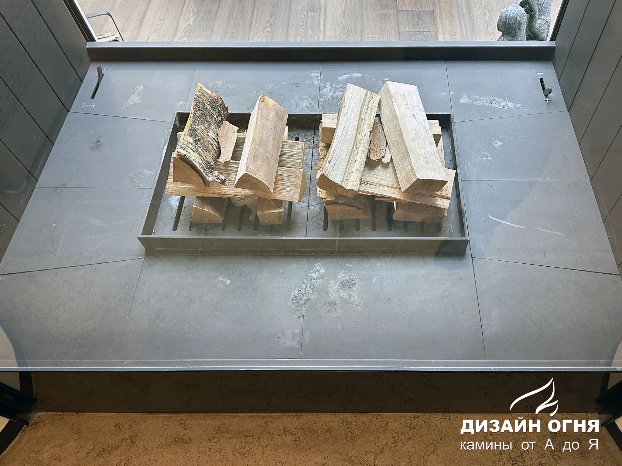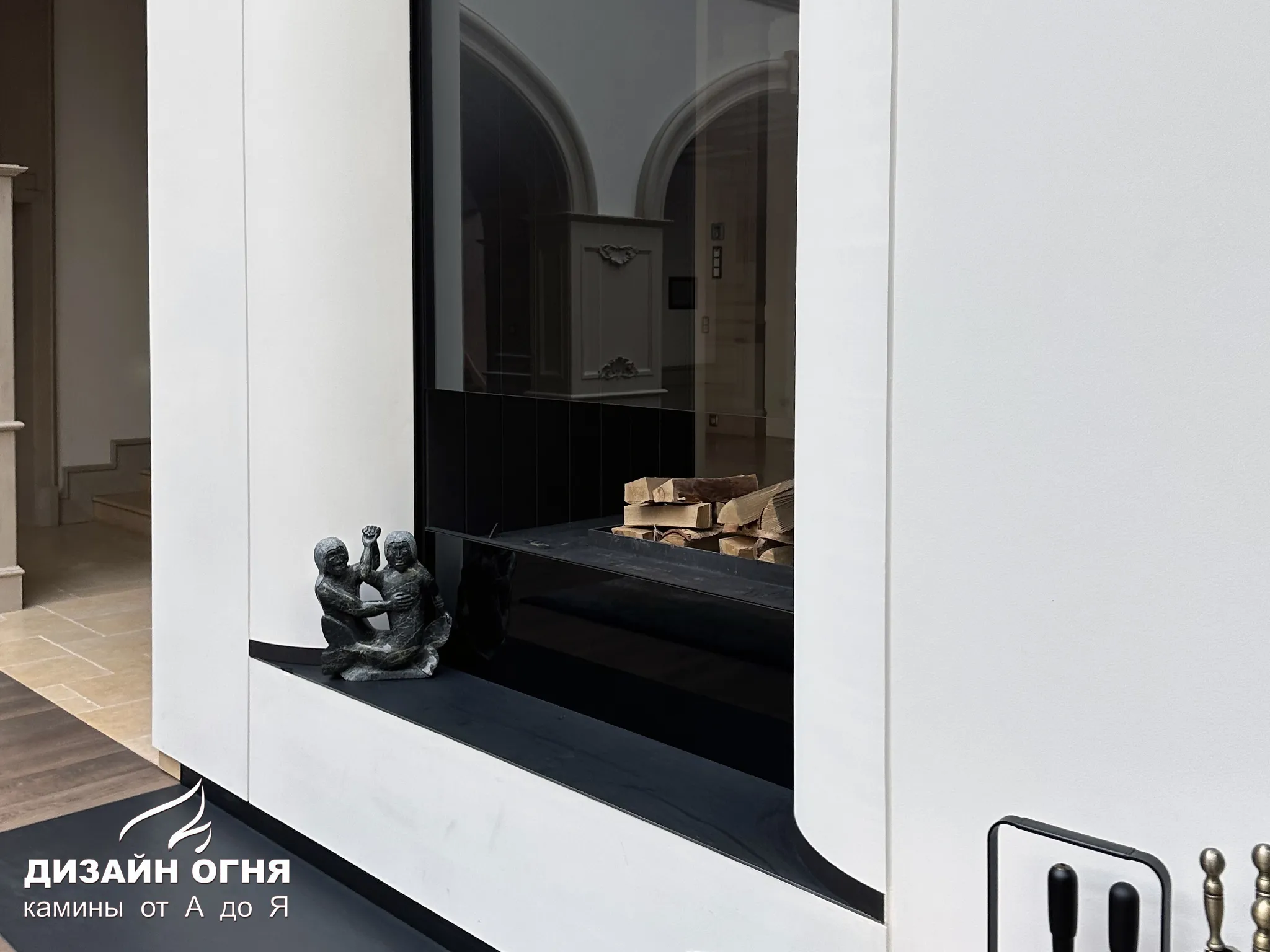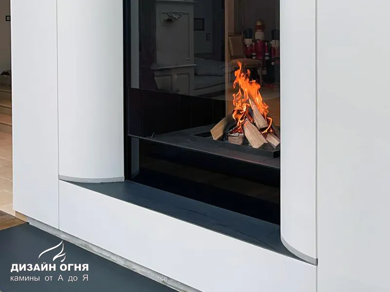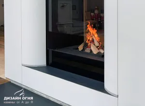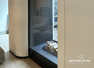 Футеровка - стальные металлические ламели. В зоне камина предусмотрены удобные ниши для хранения дров.⠀