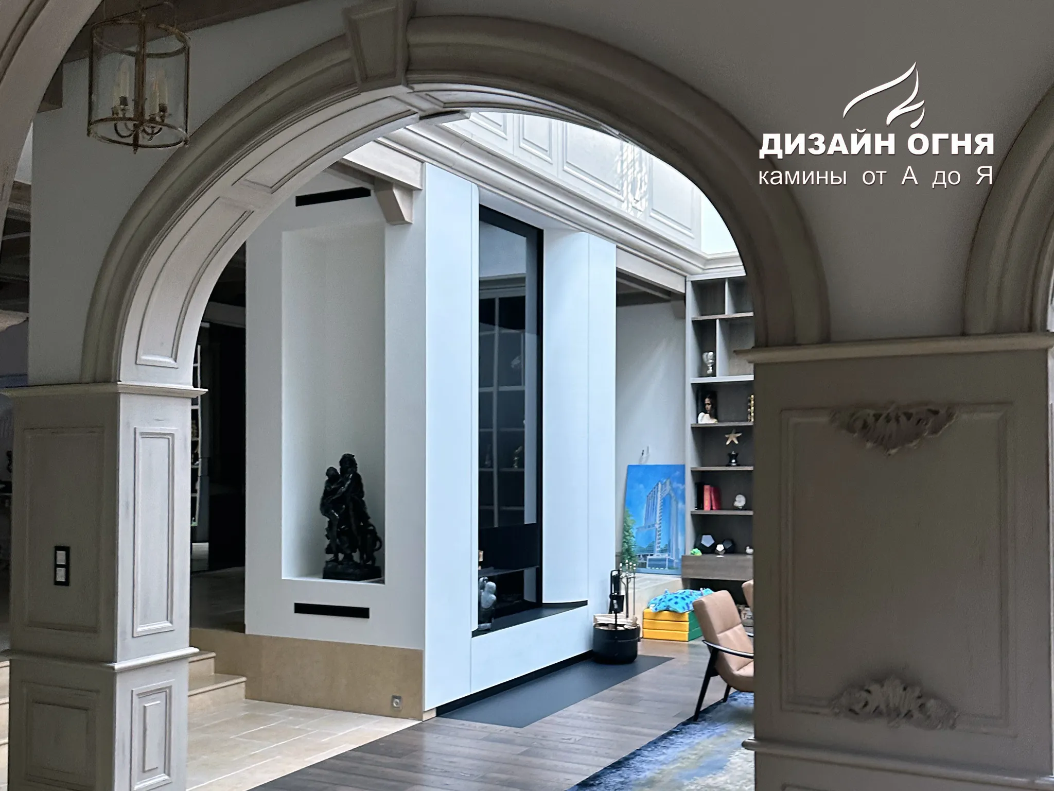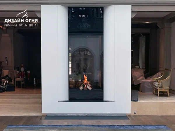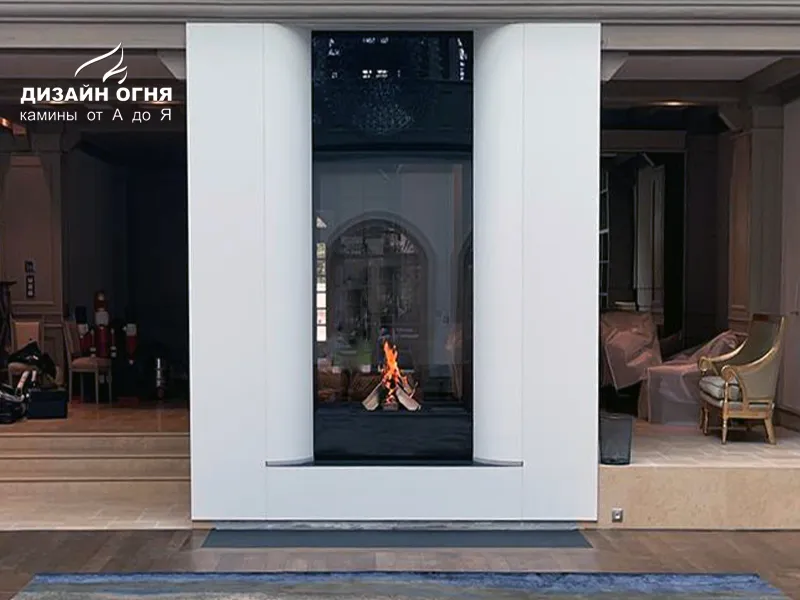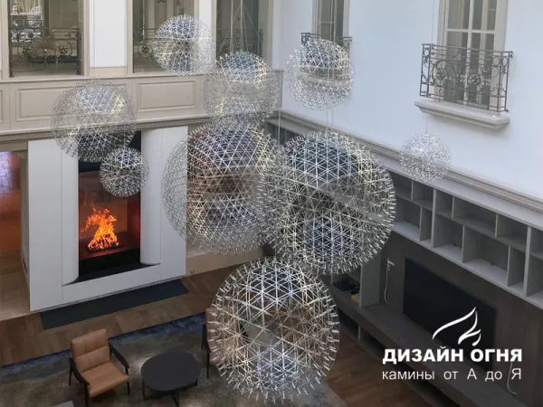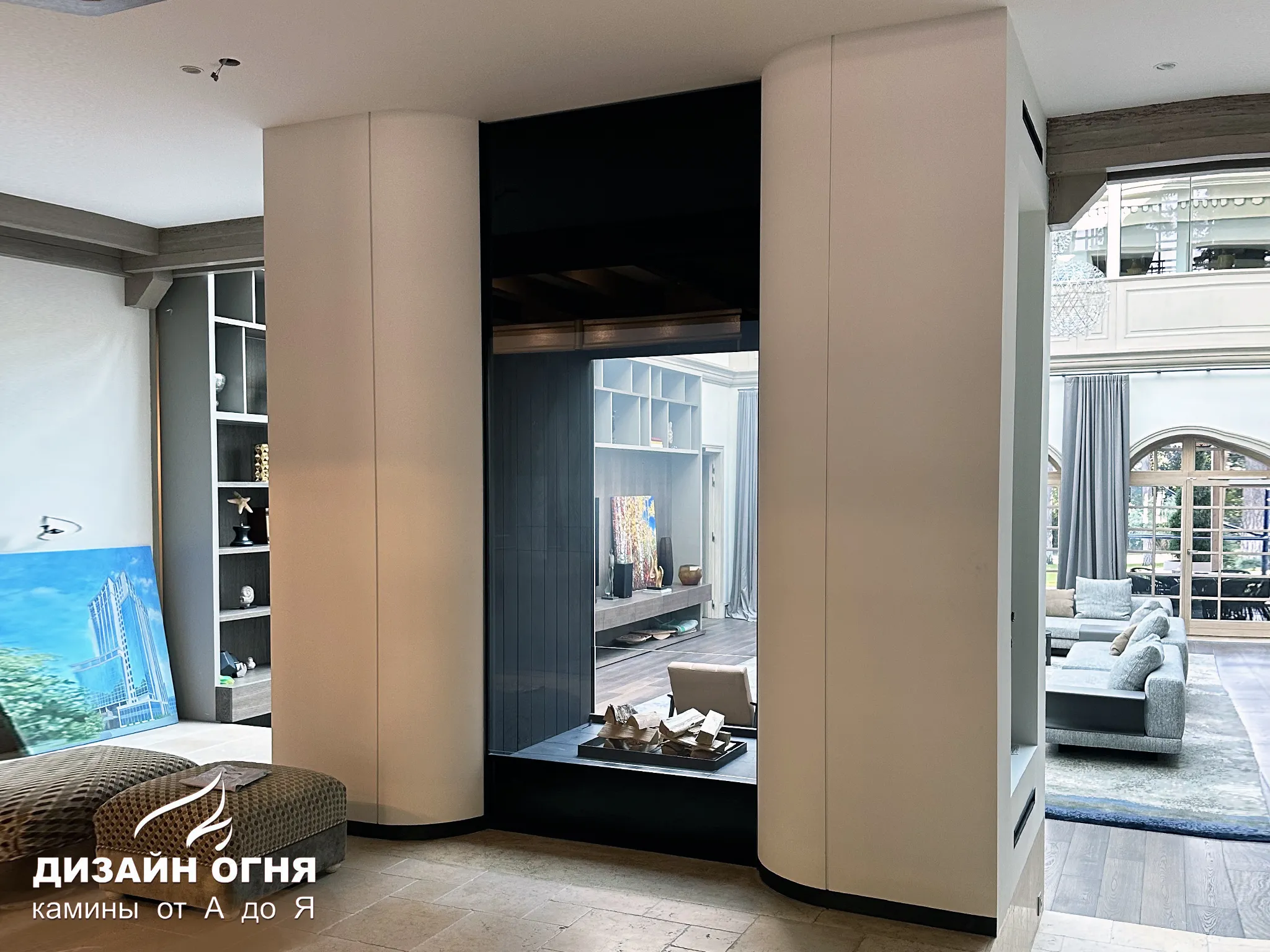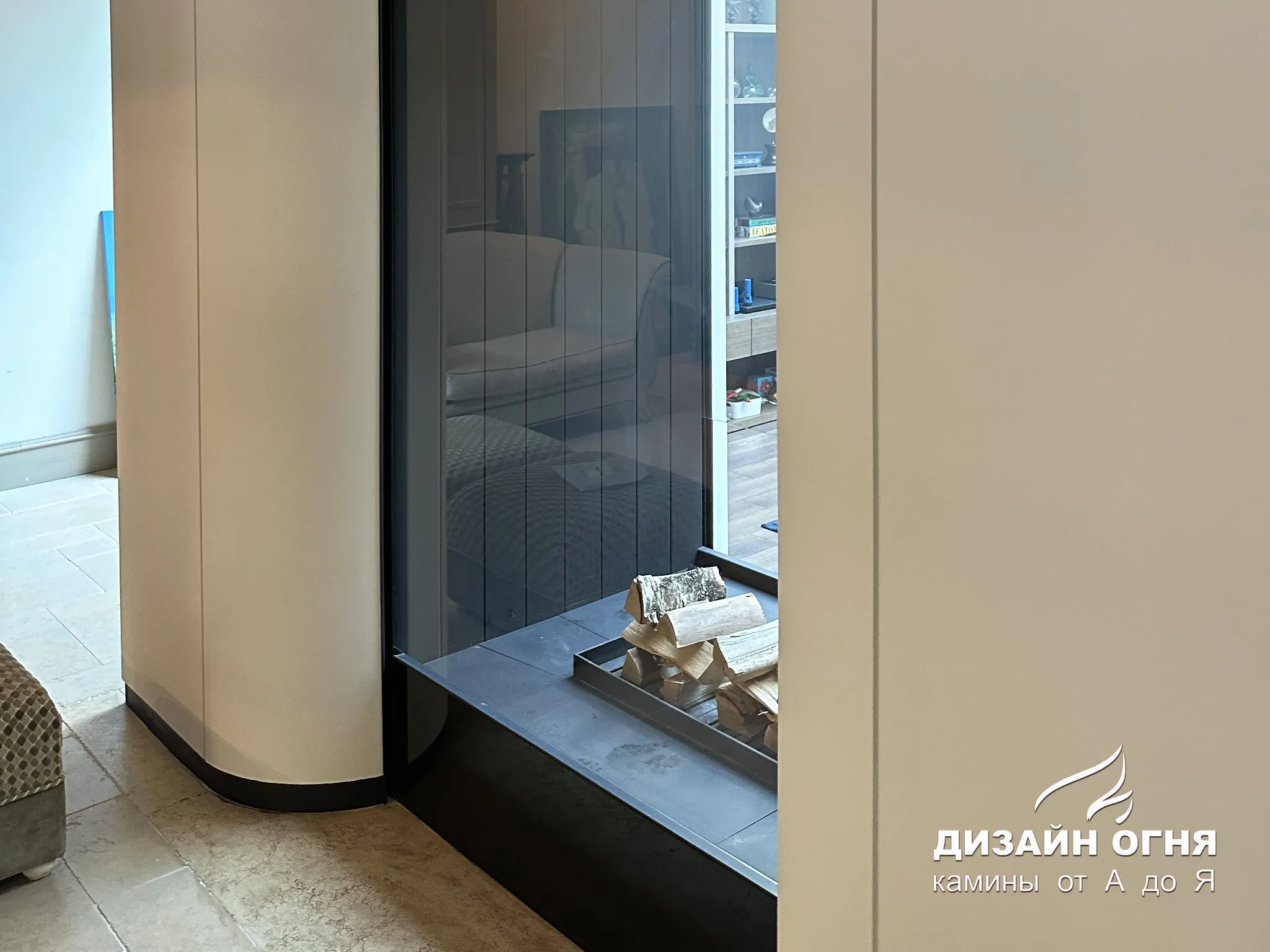 Футеровка - стальные металлические ламели. В зоне камина предусмотрены удобные ниши для хранения дров.⠀