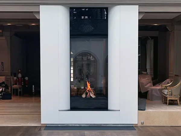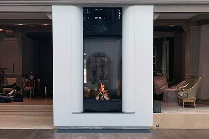 С одной стороны глухое остекление, с другой стороны - стекло с небольшим зазор для закладки дров и технического обслуживания.